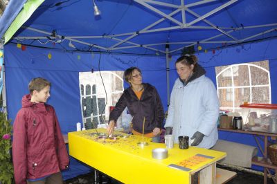 Sabine und Simone haben die Attraktion für Kinder: Kerzen tauchen. Mir macht das genau so viel Spaß und so beobachte ich erst mal die Youngsters um noch etwas dazu zu lernen. So sind einige selbst getauchte Kerzen meine weihnachtliche Marktfreude.